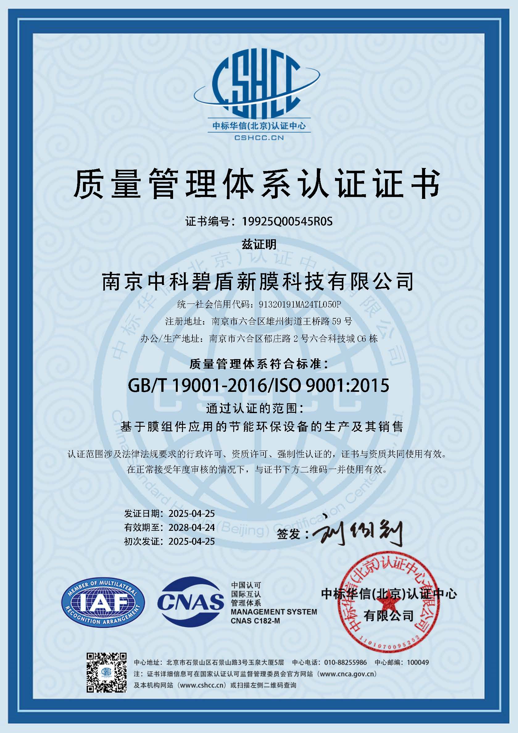 近日,南京中科碧盾新膜科技有限公司成功通過質量、環境、職業健康安全管理體系認證,標志著公司在管理水平、產品質量、環境保護及員工健康安全保障等方面達到了新的高度,為公司的可持續發展奠定了堅實基礎。